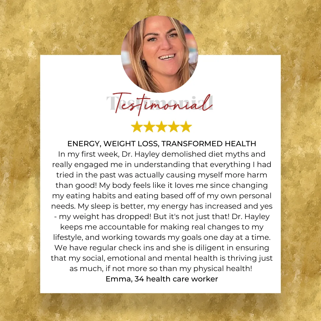 In my first week, Dr. Hayley demolished diet myths and really engaged me in understanding that everything I had tried in the past was actually causing myself more harm than good! My body feels like it loves me since changing my eating habits and eating based off of my own personal needs. My sleep is better, my energy has increased and yes - my weight has dropped! But it's not just that! Dr. Hayley keeps me accountable for making real changes to my lifestyle, and working towards my goals one day at a time. We have regular check ins and she is diligent in ensuring that my social, emotional and mental health is thriving just as much, if not more so than my physical health!