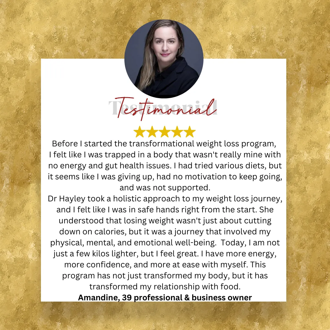 Dr. Hayley took a holistic approach to my weight loss journey, and I felt like I was in safe hands right from the start. She understood that losing weight wasn't just about cutting down on calories, but it was a journey that involved my physical, mental, and emotional well-being. Today, I am not just a few kilos lighter, but I feel great. I have more energy, more confidence, and more at ease with myself. This program has not just transformed my body, but it has transformed my relationship with food.